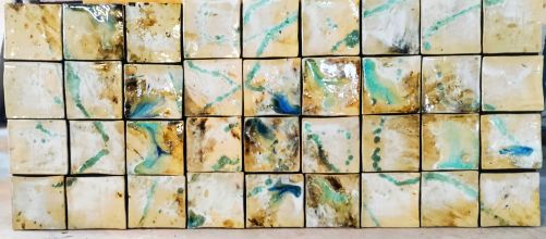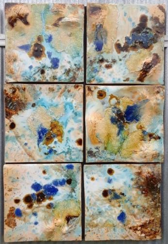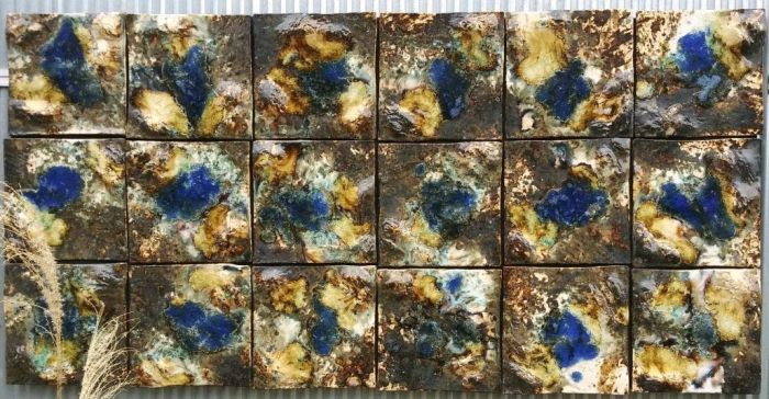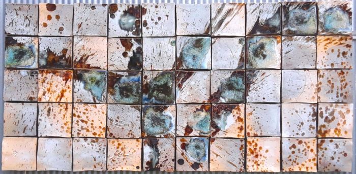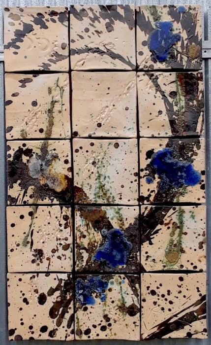 7" tiles with dramatic iron brush work and little specks of blue glass on neutral cream background.
