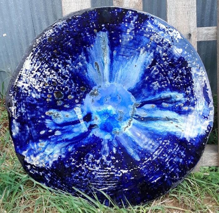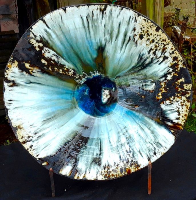 Dramatic contrast is achieved with the creamy background and strong iron brush marks that are topped with up-cycled blue and clear glass fused onto ceramic tiles.